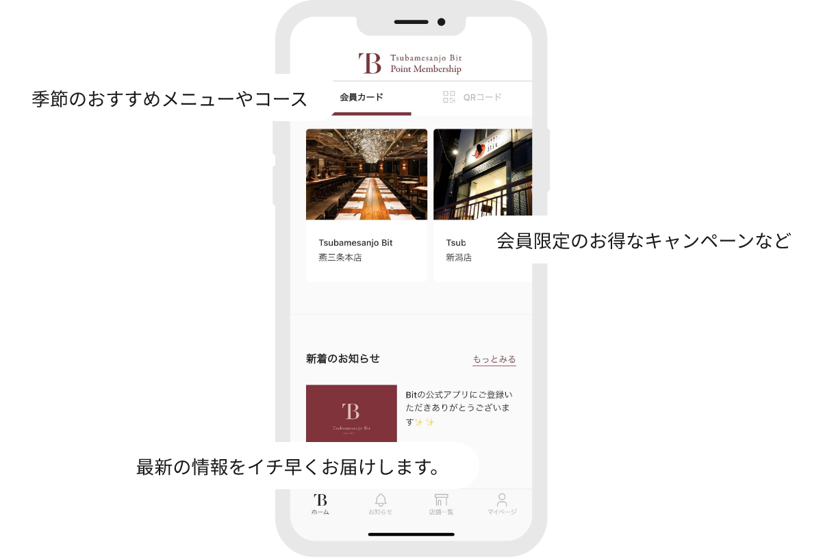 バースデークーポンの特典内容は、誕生日当月1日時点でのランクの特典が反映されます。 Tsubamesanjo Bitのレストランでご利用できます。 バースデークーポンをご利用する際は必ずオーダー時にアプリ内の画面をご提示ください。 1回のお食事、またはひとつのグループで1度のみご利用できます。 他のクーポン券との併用はできません。